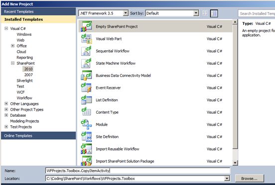 2. Create an empty SharePoint project in Visual Studio 2010 and provide the name as CopyItemActivity and click OK.