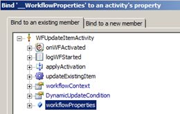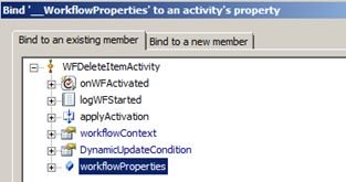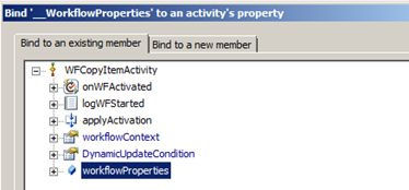 • Bind the existing property to __WorkflowProperties. Click on the button next to the __WorkflowProperties and select the existing member tab and select workflowProperties as shown below.