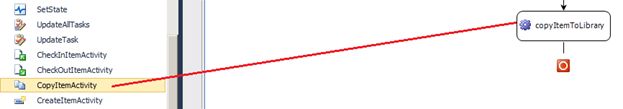13. Drag and drop the CopyItemActivity to the designer from the toolbox and provide the name as copyItemToLibrary.