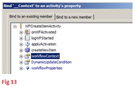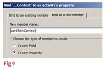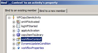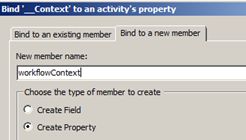 • Bind a new property to the __Context property. Click on the button next to the __Context property and select the new member tab and create the variable called workflowContext.