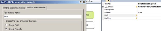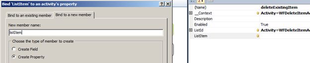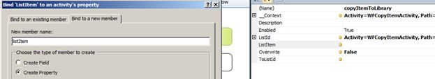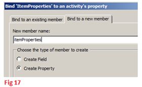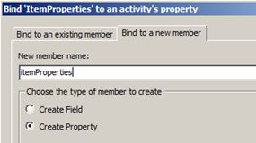 17. Right-click on CreateItemActivity and select “Bind Property ItemProperties…” and create a new member as itemProperties.