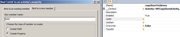 17. Bind a new property to the ToListId property. Click on the button next to the ToListId property and select the new member tab and create the variable called listId.