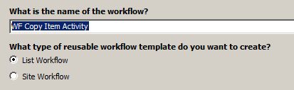 5. Click the Add button and provide the name as WF Copy Item Activity and choose List Workflow option as shown below.