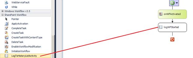 10. Drag and drop LogToHistoryListActivity to the designer and change the name to logWFStarted in the properties window.