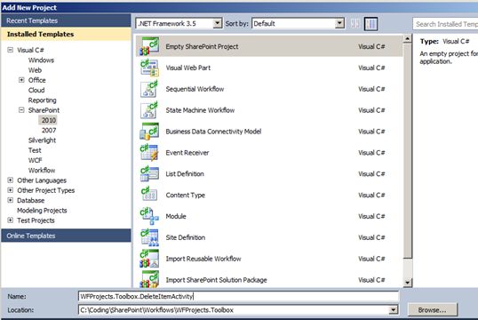 3. Create an Empty SharePoint project in Visual Studio 2010 and provide the name as DeleteItemActivity and click OK.