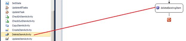 14. Drag and drop the DeleteItemActivity to the designer from the toolbox and provide the name as deleteExistingItem.