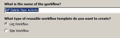 6. Click the Add button and provide the name as WF Delete Item Activity and choose List Workflow option as shown below.