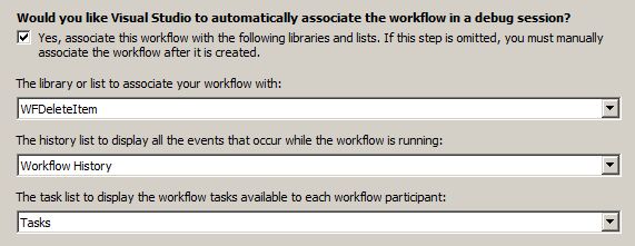 7. Click Next and associate the list to WFDeleteItem that we created in Step 1.