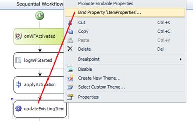 17. Right-click on UpdateItemActivity and select “Bind Property ItemProperties…” and create a new member as itemProperties.
