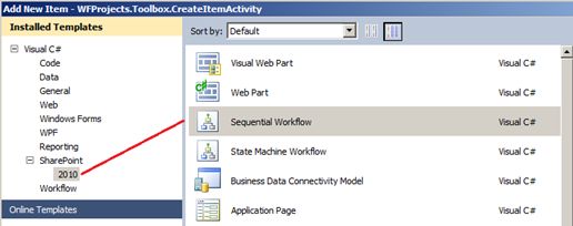 4. Right-click on the project and add new item as Sequential Workflow and provide the name as WFCreateItemActivity