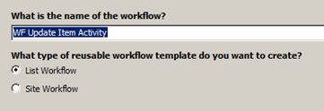 5. Click the Add button and provide the name as WF Update Item Activity and choose the List Workflow option as shown below.