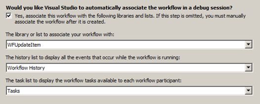 6. Click Next and associate the list to WFUpdateItem that we created in Step 1.