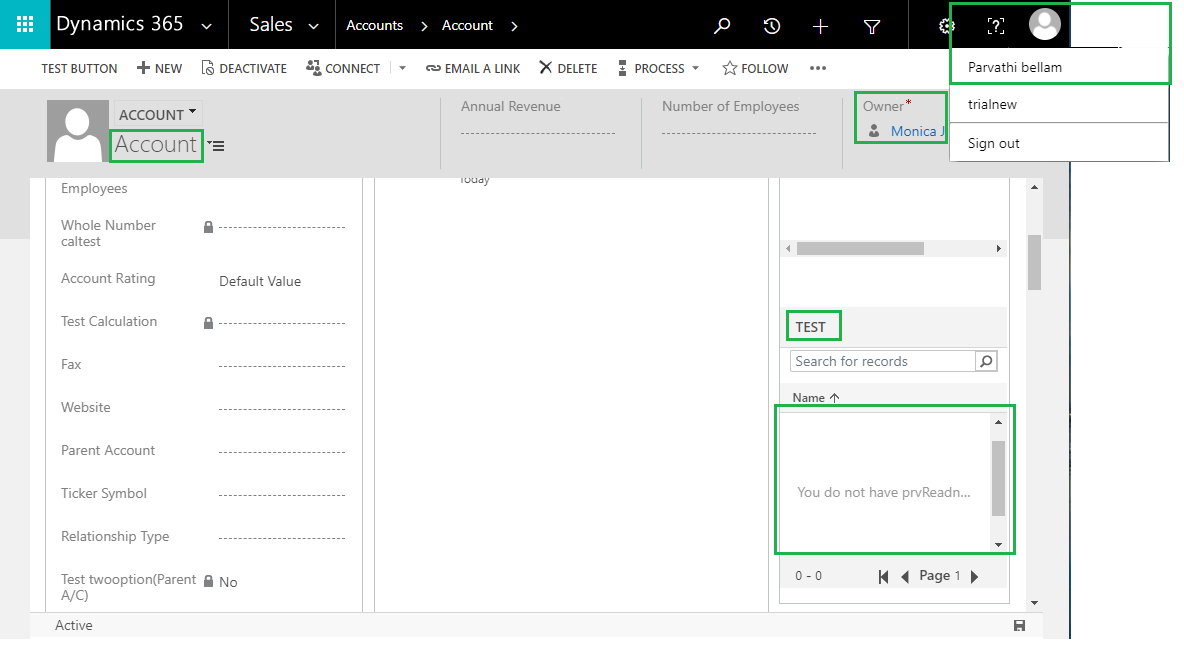 An Account record is assigned from one user ”Monica” to another user ”Parvathi”, then related records of phone call(Regarding), only Active call will be assigned to another user as Assign action is set to Cascade Active.